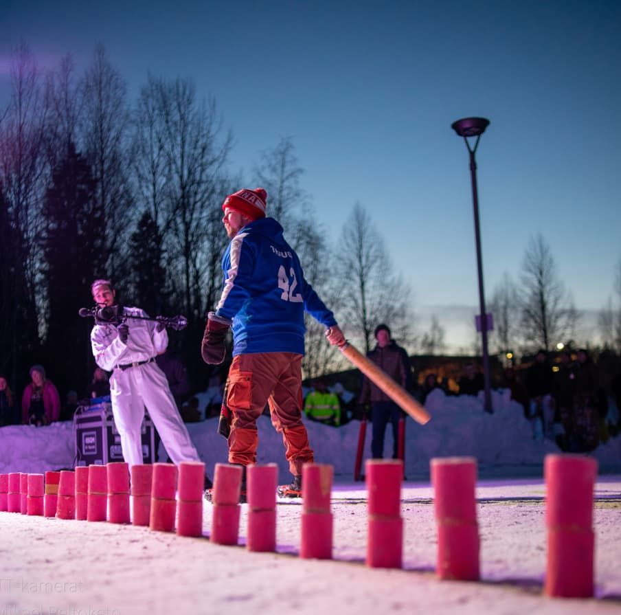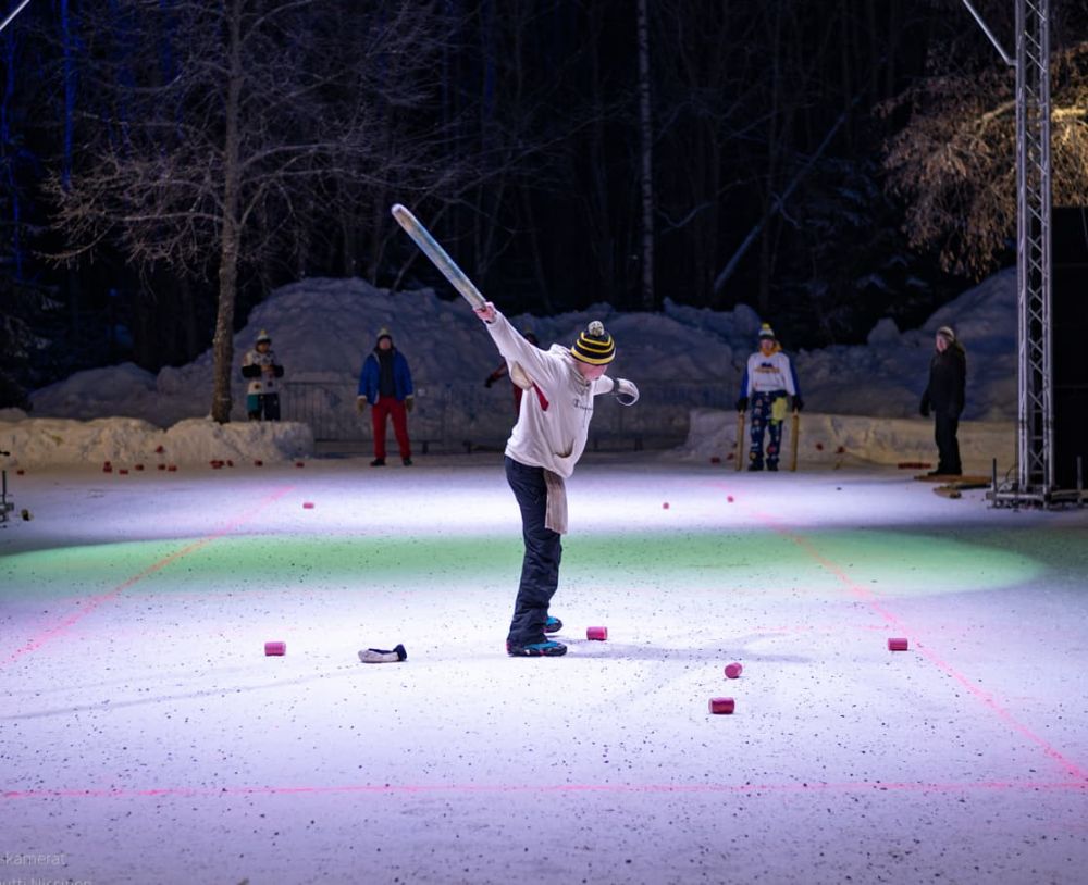 Kentällä on lunta, kädessä on karttu ja/tai olut